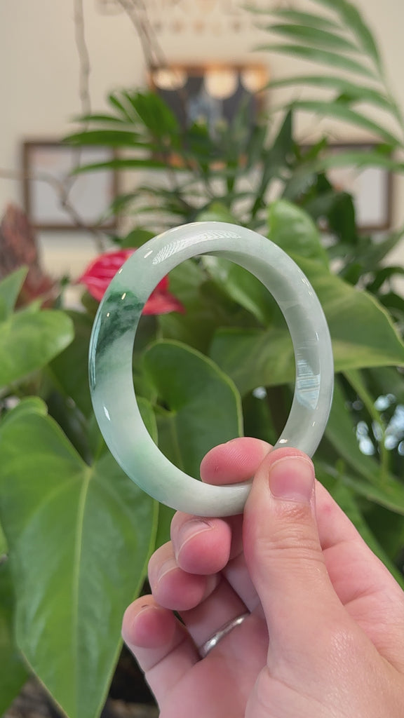 * DETAILS--This bangle is made with genuine Burmese Jadeite jade, The jade texture is very smooth with unique blue green color. The blue green color looks very nice as landscape painting. It's a very unique bangle. You know the genuine jade bangle is always meaningful for someone. The Classic half-round wider style bracelet. It's a special gift for yourself or your love.