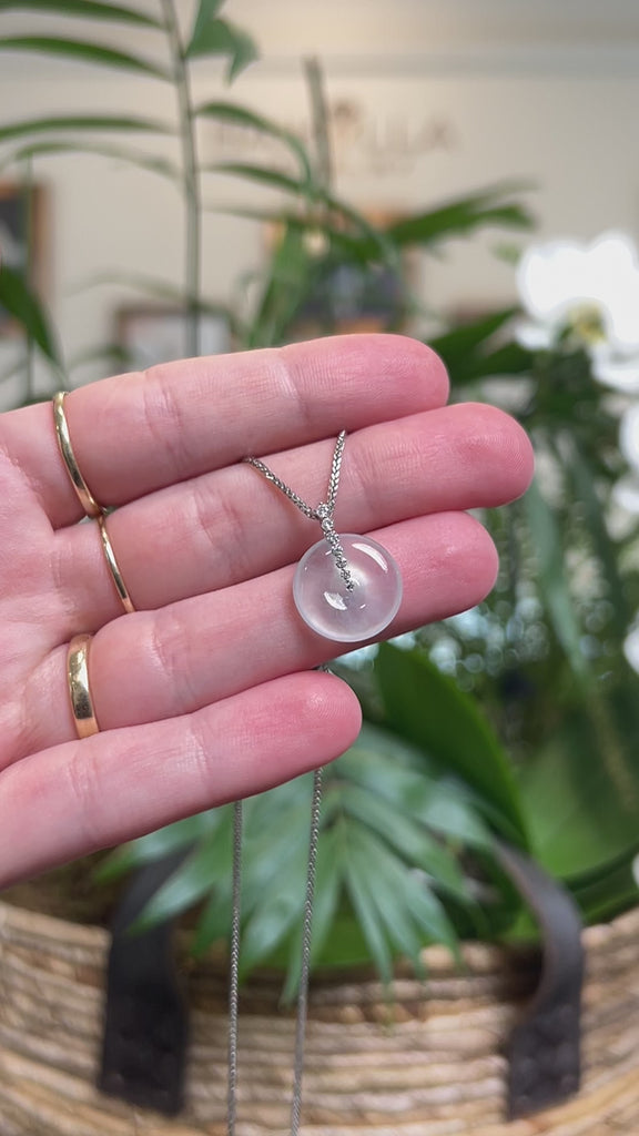 * Design Concept--- The Ping An Kou (Good Luck Button) is a Chinese symbol of peace, protection and well-being, believed to ward off negative energy and bring good fortune. This pendant is made with natural genuine Burmese jadeite jade featuring an icy white color throughout. The jade texture is so smooth and translucent with no natural lines and minimal cloudy spots. The pendant is finished with an 18k white gold bail, dazzled with natural diamonds. Gifting one of these is like wishing the best of luck to your family or loved ones.