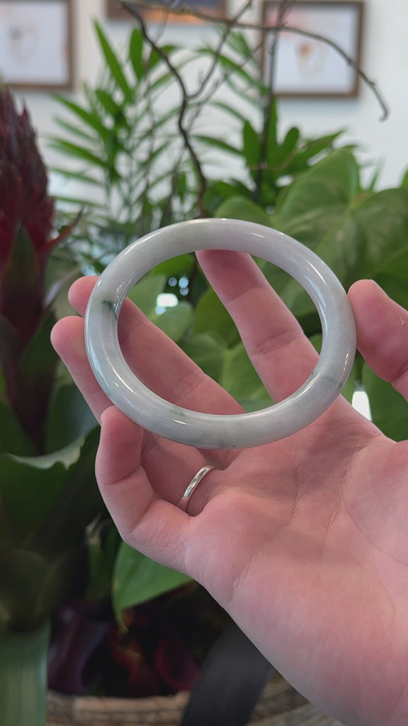 * DETAILS--- This exquisite bangle is crafted from premium Burmese Jadeite in a light white hue. With its smooth, translucent texture and blue green floating flower pattern, it radiates a timeless elegance. The classic full-round traditional design enhances the jade’s natural beauty with simplicity, making this bracelet a cherished addition to any jewelry collection. Just has a small natural line and few cloudy spots. This bangle has such a unique blue-green color spots make this piece a thoughtful, one-of-a-kind gift for yourself or someone truly special.