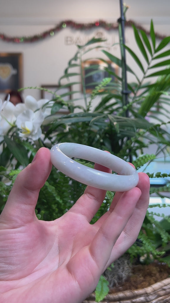 * DETAILS--- This oval bangle is made with natural Burmese jadeite jade. The jade texture is very smooth and translucent with minimal natural lines and cloudy spots. The color is a light green and white color throughout. It's a half round, comfort-fit bangle, which is flat on the inside and comfortable for everyday wear. Known for its durability, jadeite is also believed to bring good luck. This bangle makes a thoughtful and meaningful gift for yourself or someone special.
