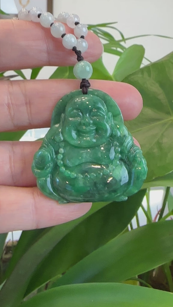*Design concept--- Made with genuine Burmese jadeite jade. The excellent craftsmanship portrays the "goddess of compassion", the Happy Buddha. The handcraft is stunning. This particular necklace has amazing green color, just the texture is rough with clouds. It's a bigger size and affordable for you and your love. .