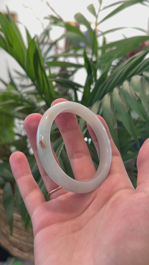 * DETAILS--- This bangle is crafted from genuine Burmese Jadeite jade. It features a smooth, semi translucent texture with an even light green color inside and small patches of SaJin "Golden Dust" flower .The texture is smooth and fine with no natural lines and minimal cloudiness. It's a half round, comfort-fit bangle, which is flat on the inside of the bangle and comfortable for everyday wear. Known for its durability, jadeite is also believed to bring good luck. This bangle makes a thoughtful and meaningful gift for yourself or someone special.