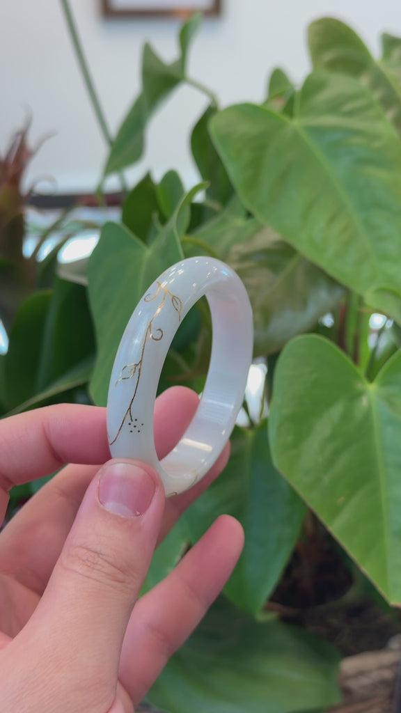 * DETAILS--- This bracelet is crafted from genuine Burmese light green Jadeite Jade with 18k gold inlays. The jade’s texture is very smooth and translucent, featuring a captivating light green and faint red color through out, with no natural lines and very little small cloudy spots. The bangle has good translucency and beautiful very smooth texture. With 18k yellow gold inlay through out the bangle. The gold inlay are guaranteed for life (conditions apply), but proper care is required for the bangle. The bangle has a classic half-round style that enhances its elegance also offers comfort, making it a perfect piece for jade lovers and collectors alike. Smaller size bangle. It's a very unique bangle for yourself or your love. It's a collectible item.