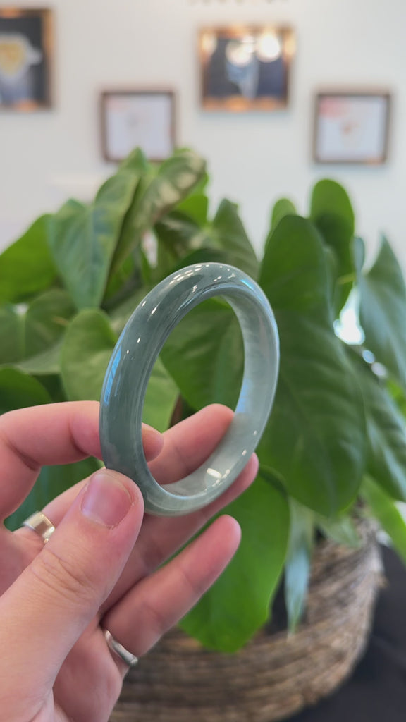 * DETAILS--- Genuine Burmese Jadeite Jade Bangle Bracelet. This bangle is made with high-quality genuine Burmese Ice blue-green Jadeite jade, The jade texture is so smooth and translucent. The blue-green color and translucent, truly a mesmerizing combination. The Classic half-round style bracelet with rose gold morning glory flowers carvings in the cracks. this bangle looks completely beautiful with blue-green. It is a wider size bangle. It's a very unique bangle for yourself or your love. It's a collectible item.
