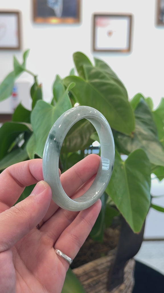 * DETAILS--- Genuine Burmese Jadeite Jade Bangle Bracelet. This bangle is made with high-quality genuine Burmese Ice blue-green Jadeite jade, The jade texture is fine and translucent with some small cloudy spots. The icy blue-green color and translucent texture is truly a mesmerizing combination. The Classic half-round style bangle looks completely beautiful with blue-green. It's a very unique bangle for yourself or your love.