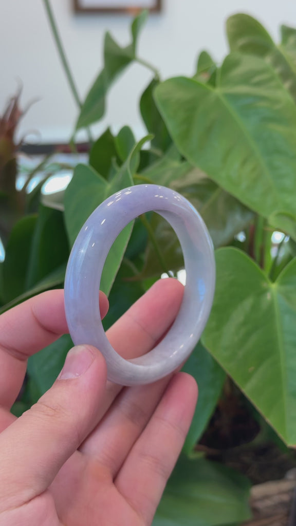 * DETAILS--- This bracelet is crafted from quality, genuine Burmese lavender green Jadeite Jade with a patch of faint green color. The jade’s texture is smooth and translucent, featuring a captivating light lavender color through out, with no natural lines and very little small cloudy spot with some yellow. The bangle has good translucency and beautiful semi fine texture. The bangle has a classic half-round style that enhances its elegance also offers comfort, making it a perfect piece for jade lovers and collectors alike.