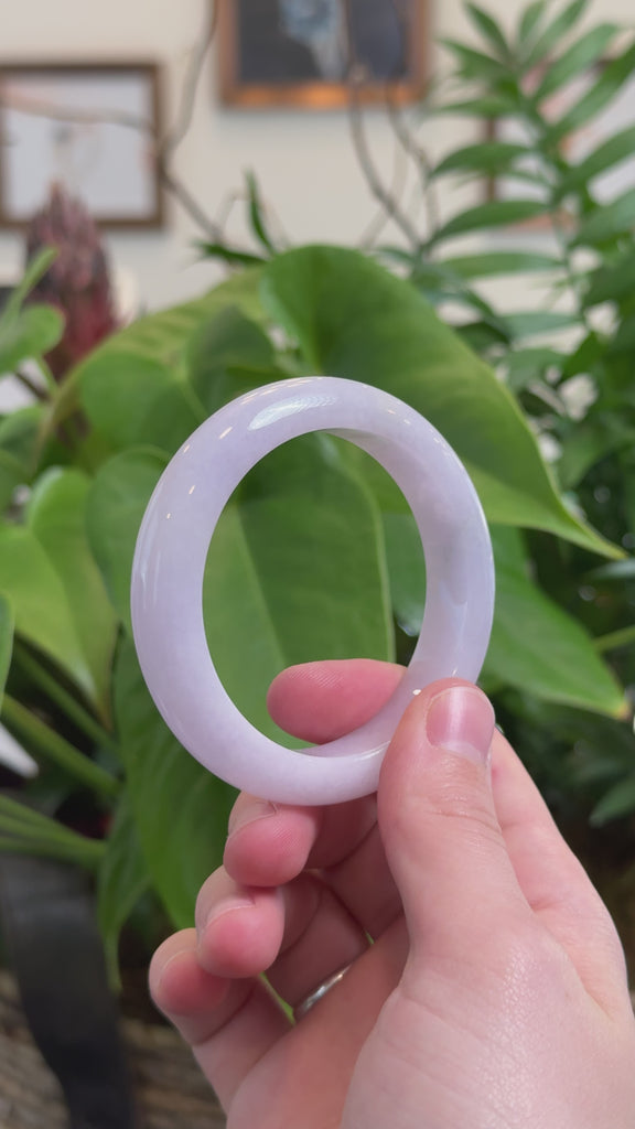 * DETAILS--This bangle is made from high-quality genuine Burmese Jadeite jade. It has a very smooth & translucent texture with a beautiful pink-lavender color throughout. The classic half-round design offers comfort and style. Jadeite jade is one of the toughest gemstones, and it's believed to bring good luck. This bangle makes a special gift for you or a loved one.