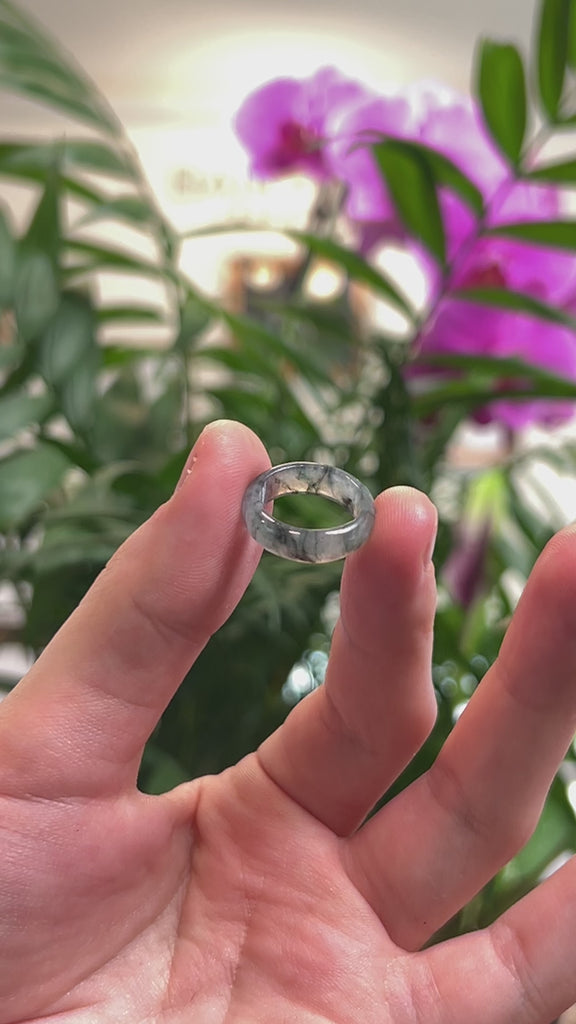 Baikalla Icy Black Wuji & Green Burmese Jadeite Jade Traditional Ring #3.25