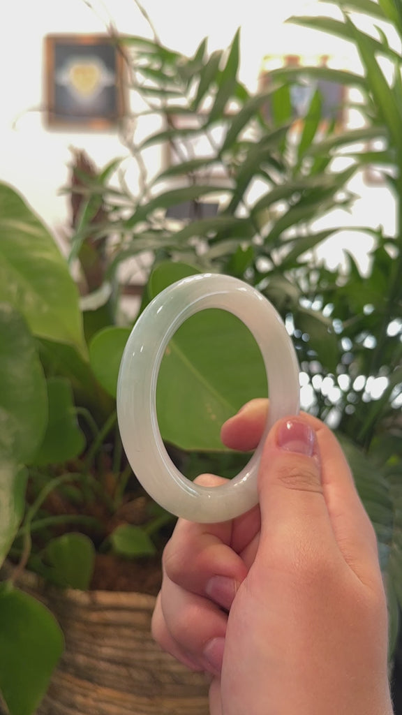 * DETAILS--- This bangle is crafted from genuine Burmese Jadeite jade. It features a smooth, semi translucent texture with a soft green hue throughout, more vibrant on one side. Some cloudy spots and natural lines. It's a full round, traditional bangle, which is fully round throughout the bangle and this bangle features a wider width making this a more unique and bold bangle. Known for its durability, jadeite is also believed to bring good luck. This bangle makes a thoughtful and meaningful gift for yourself or someone special.