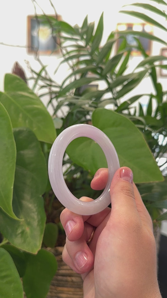 * DETAILS--- This bangle is crafted from genuine Burmese Jadeite jade. It features a smooth, semi translucent texture a light icy lavender hue throughout. It's a full round, traditional bangle, which is fully round throughout the bangle and this bangle features a wider width making this a more unique and bold bangle. Known for its durability, jadeite is also believed to bring good luck. This bangle makes a thoughtful and meaningful gift for yourself or someone special.