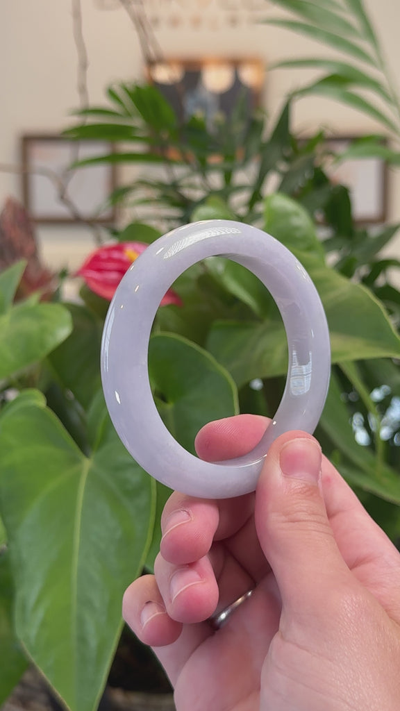* DETAILS--- This beautiful bangle is made from natural Burmese Jadeite jade, featuring very smooth texture, with beautiful icy lavender color through out. It's a half round, comfort-fit bangle, which is flat on the inside of the bangle and comfortable for everyday wear. This bangle has very few visible texture, overall very smooth with some spots of cloudy texture and very few natural lines. A timeless piece, perfect as a thoughtful gift for yourself or someone truly special.