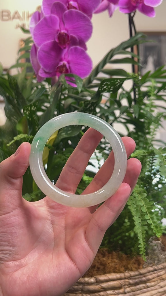 * DETAILS--- This bangle is crafted from fine quality genuine Burmese Jadeite jade that features an icy texture throughout with a light yellow-ish green color on one side and a vibrant apple-green on the other side. The texture is translucent and silky smooth with no natural lines and minimal cloudy spots. It's a full round, traditional bangle, which is fully round throughout the bangle. Known for its durability, jadeite is also believed to bring good luck. Whether as a gift for yourself or a loved one, this jade bangle is a meaningful treasure that combines natural beauty, lasting craftsmanship, and exceptional value to cherish for years to come.