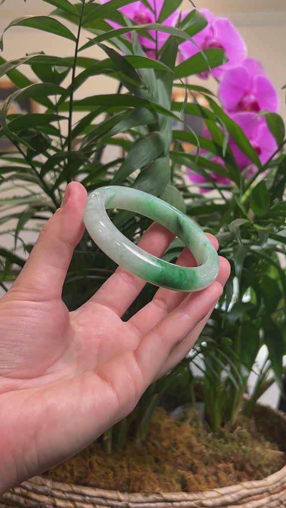 * DETAILS--- This bangle is crafted from fine quality, genuine Burmese Jadeite jade that features an icy green base color with vibrant green flowers throughout and small flecks of black Wuji(乌鸡) "black chicken". The texture is semi-smooth and translucent with no natural lines and some cloudy spots. The combination of the icy texture and the vibrant green colors is truly unique and mesmerizing.