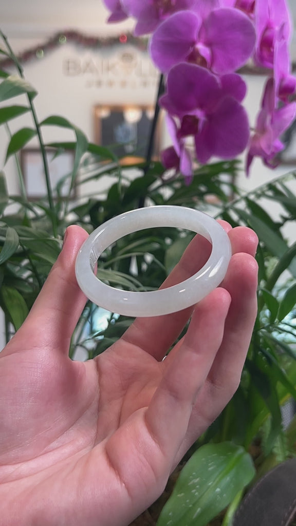 *DETAILS--- This oval bangle is crafted from high quality, natural Burmese Jadeite jade that features an icy light green color throughout. The jade texture is smooth and translucent with no natural lines and minimal cloudy spots. It's a half-round, comfort fit oval bangle that is flat on the inside, making it comfortable for everyday wear. Known for its durability, jadeite is also believed to bring good luck. Whether as a gift for yourself or a loved one, this jade bangle is a meaningful treasure that combines natural beauty, lasting craftsmanship, and exceptional value to cherish for years to come.