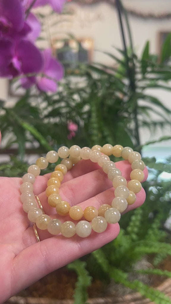 * DETAILS---This bracelet is made with fine quality, natural Burmese jadeite jade beads that feature a blend of icy yellow colors (yellow hues on each bead may vary, sent at random). The jade texture is so smooth and translucent. Known for its durability, jadeite is also believed to bring good luck. Whether as a gift for yourself or a loved one, this jade beaded bracelet is a meaningful piece.
