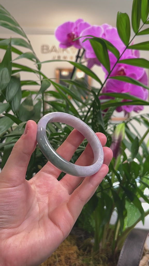 * DETAILS--- This bangle is crafted from genuine Burmese Jadeite jade that features purple lavender and grey-ish lavender colors that blend into a large patch of oil-green color. The combination of these colors is so unique and mesmerizing. The texture is smooth and translucent with no natural lines and minimal cloudy spots.