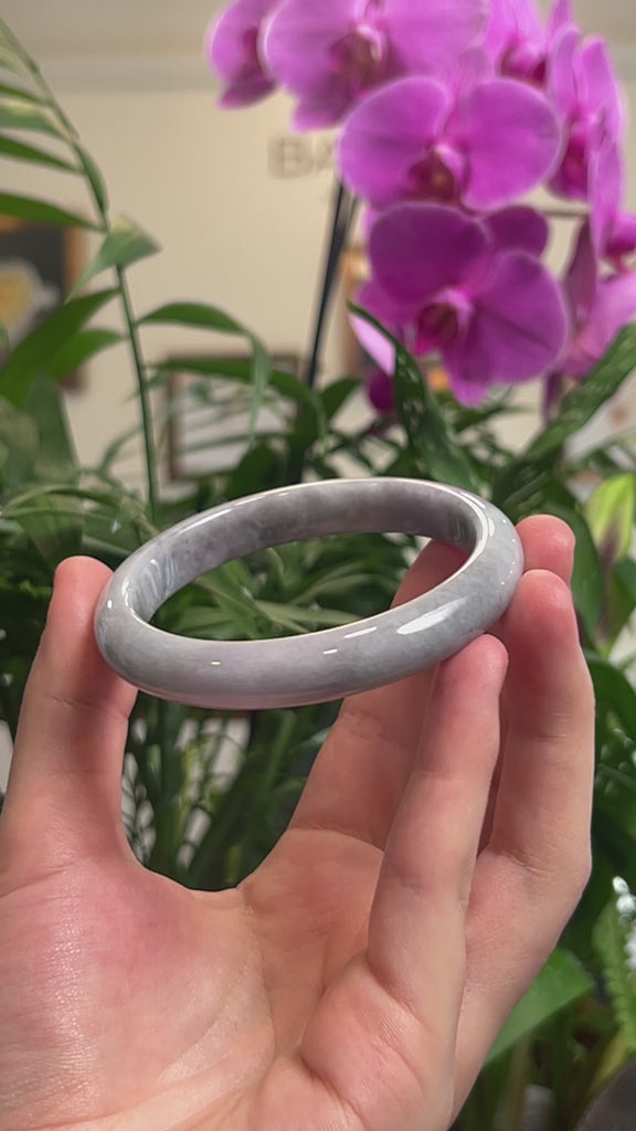 *DETAILS--- This bangle is crafted from natural Burmese Jadeite jade that features a a lavender color throughout, blended with grey Wuji "black chicken", a black-ish grey tone. The texture is semi-smooth and translucent with minimal natural lines and cloudy spots. Designed in a half-round, comfort-fit style, the bangle is flat on the inside for a comfortable feel, perfect for everyday wear. Known for its durability, jadeite is also cherished as a symbol of good luck, protection, and harmony. Whether as a gift for yourself or a loved one, this jade bangle is a meaningful treasure that combines natural beauty, lasting craftsmanship, and exceptional value to cherish for years to come.