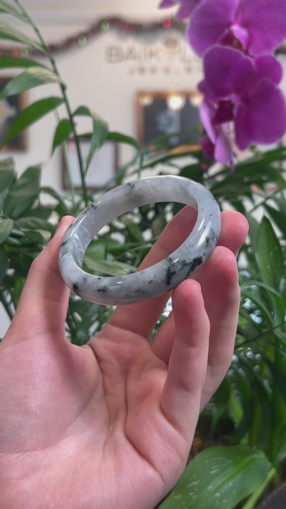 *DETAILS--- This bangle is crafted from natural Burmese Jadeite jade that features a a light blue-green base color with deep blue-green flowers throughout. The texture is semi-smooth and translucent with some natural lines and cloudy spots. Designed in a half-round, comfort-fit style, the bangle is flat on the inside for a comfortable feel, perfect for everyday wear. Known for its durability, jadeite is also cherished as a symbol of good luck, protection, and harmony. Whether as a gift for yourself or a loved one, this jade bangle is a meaningful treasure that combines natural beauty, lasting craftsmanship, and exceptional value to cherish for years to come.