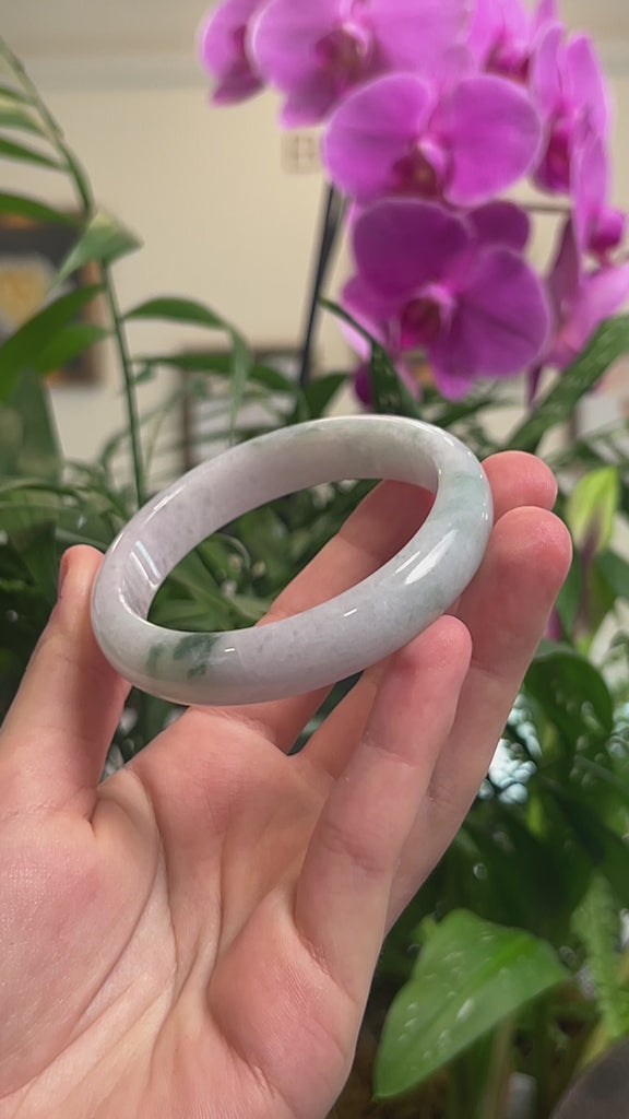 *DETAILS--- This bangle is crafted from natural Burmese Jadeite jade that features a light green and light lavender base color with deep green flower patches and a light yellow Sajin speck (Golden Dust). The texture is semi-semi-smooth and translucent with some minimal lines and cloudy spots that reflect the jade's genuine character.