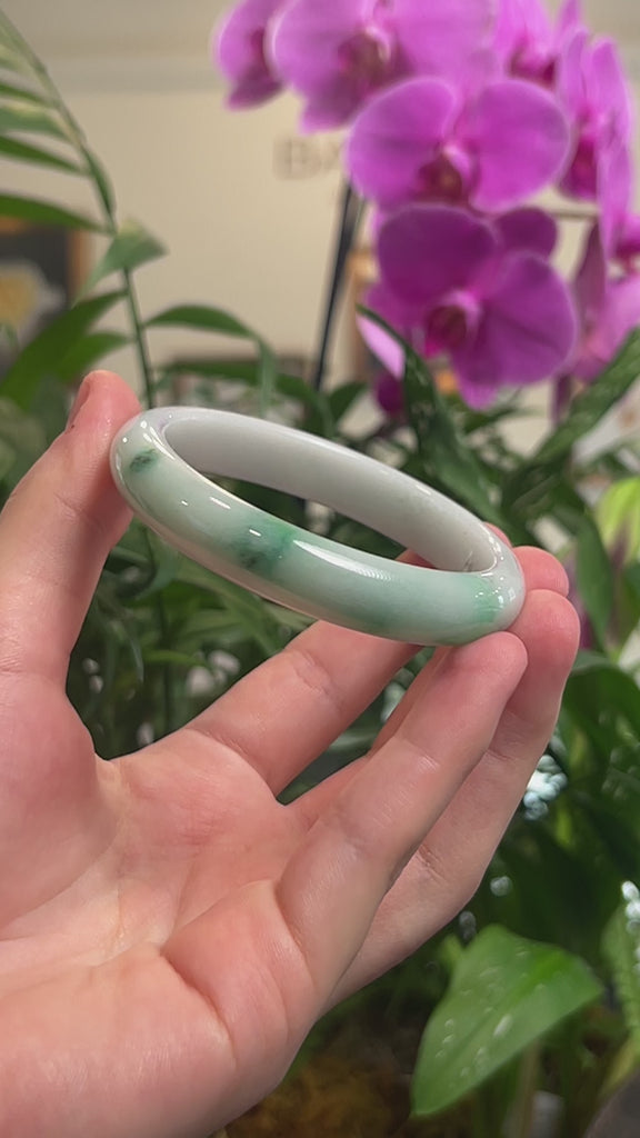 *DETAILS--- This bangle is crafted from natural Burmese Jadeite jade that features a a light green base color with vibrant green flowers throughout. The texture is smooth and translucent with minimal natural lines and cloudy spots. Designed in a half-round, comfort-fit style, the bangle is flat on the inside for a comfortable feel, perfect for everyday wear. Known for its durability, jadeite is also cherished as a symbol of good luck, protection, and harmony. Whether as a gift for yourself or a loved one, this jade bangle is a meaningful treasure that combines natural beauty, lasting craftsmanship, and exceptional value to cherish for years to come.