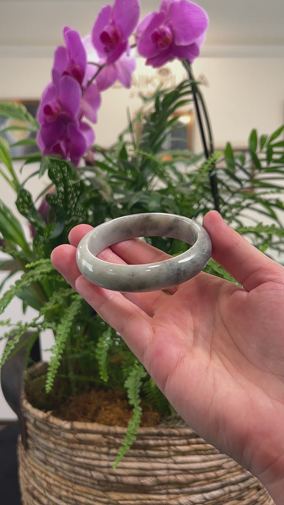 * DETAILS--- This bangle is crafted from genuine Burmese Jadeite jade. It features a light white-green base color with WuJi (乌鸡) "black chicken" a blackish grey tone throughout that makes it truly captivating and unique. The jade texture is smooth with some natural lines and cloudy spots that reflects the jade’s genuine character. These organic features also make this piece more accessible and affordably priced, offering exceptional beauty and value.