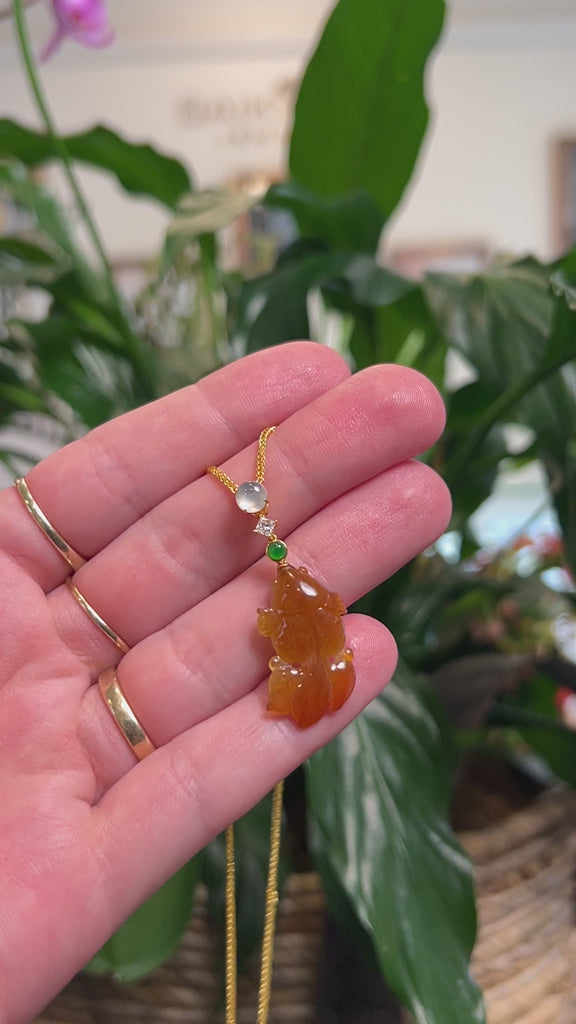 * Design Concept--- This pendant is intricately carved in the shape of a Lucky Fish. It is crafted from natural, genuine Burmese jadeite jade, showcasing a beautiful orange-ish red color throughout, complemented by a lighter orange patch on the back inspired by the belly of a koi fish. The jade features a beautifully smooth, luminous translucency, with no visible natural lines and only minimal cloudy areas, highlighting its exceptional quality. Completing the design is an elegant solid 18K yellow gold bail, adorned with an icy white jade cabochon, a natural diamond, and a luminous imperial green jade cabochon. This charming and meaningful piece makes a truly special gift—whether for yourself or a loved one.