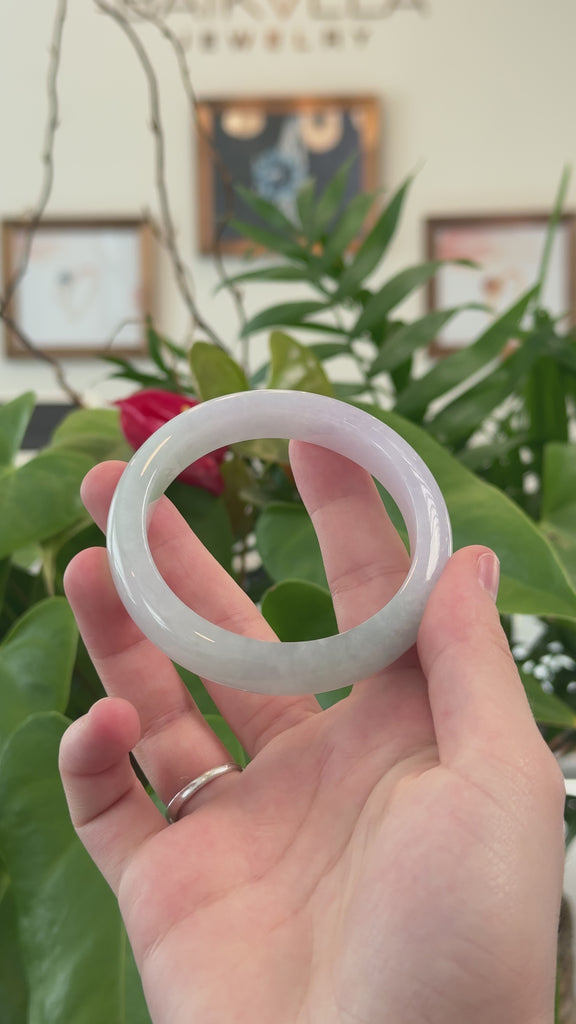 * DETAILS--This exquisite bangle is crafted from premium Burmese jadeite, showcasing a beautiful blend of light lavender and green tones. Its smooth texture and timeless design exude elegance. Some small natural lines inside on the inside. The classic colors and translucency perfectly highlights the natural beauty of the jade, making it a versatile and stylish piece. A meaningful and thoughtful gift — perfect for yourself or someone truly special.