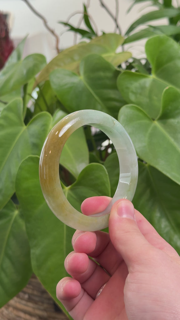 * DETAILS---This stunning jade bangle is crafted from high-quality Burmese jadeite with a beautiful yellow and oil green hue. Its smooth texture and timeless elegance make it a true standout. The classic half-round shape ensures a comfortable fit while showcasing the natural beauty of the jade. With its luxurious look, this jade bangle is not just a piece of fine jewelry, but also a meaningful gift — perfect for yourself or someone special.