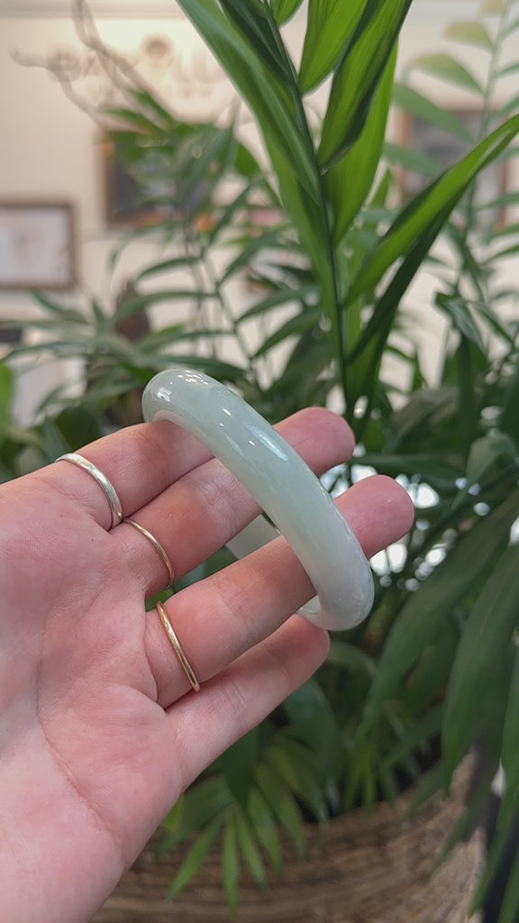 * DETAILS--- This beautiful bangle is made from natural Burmese Jadeite jade, featuring a smooth, icy texture and an overall gentle green color with patch of lighter green color. It's a half round, comfort fit bangle, which makes this bangle flat on the inside that touches your wrist, making it a more comfortable for everyday wear. This bangle is more standard width, which is great for a high quality bangle and gives the bangle a more traditional look. This bangle has few visible texture, overall very smooth and no natural lines. A timeless piece, perfect as a thoughtful gift for yourself or someone truly special.