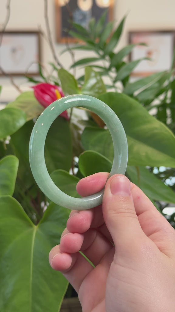 * DETAILS--This exquisite bangle is crafted from premium Burmese jadeite in a lovely green color. With its even, captivating color throughout the bangle, it radiates a timeless elegance and cultural heritage. Some small natural cloudy spots. The half round comfort design enhances the jade’s natural beauty with clarity and simplicity, making this bracelet a cherished addition to any jewelry collection. Known to symbolize protection and strength, jade bangles hold deep meaning, making this piece a thoughtful, one-of-a-kind gift for yourself or someone truly special.