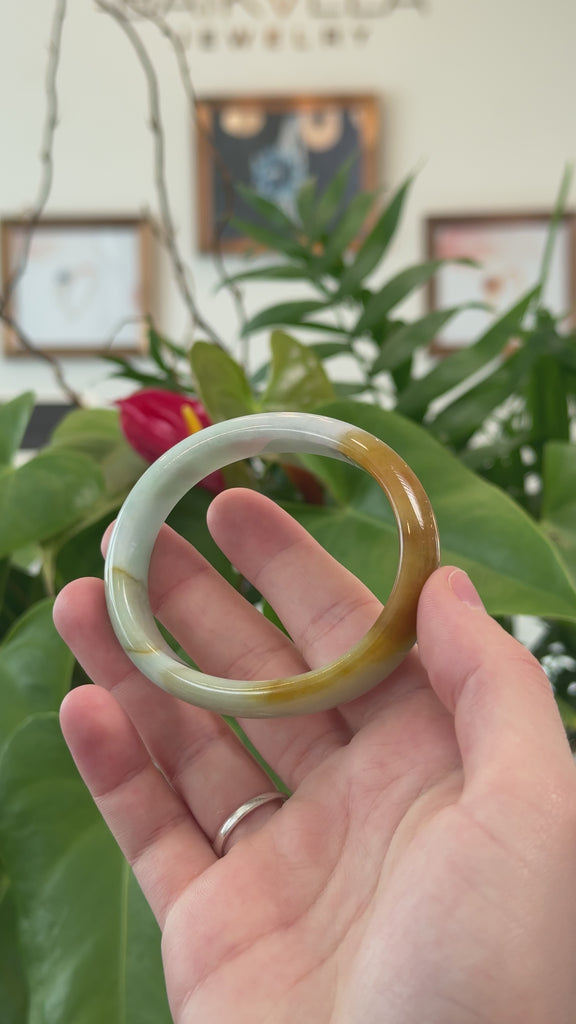 * DETAILS--This exquisite bangle is crafted from premium Burmese jadeite, showcasing a beautiful blend of green tones featuring a large red color patch. Its oval style is great for petite, flat wrists making it a versatile and stylish piece. A meaningful and thoughtful gift — perfect for yourself or someone truly special.