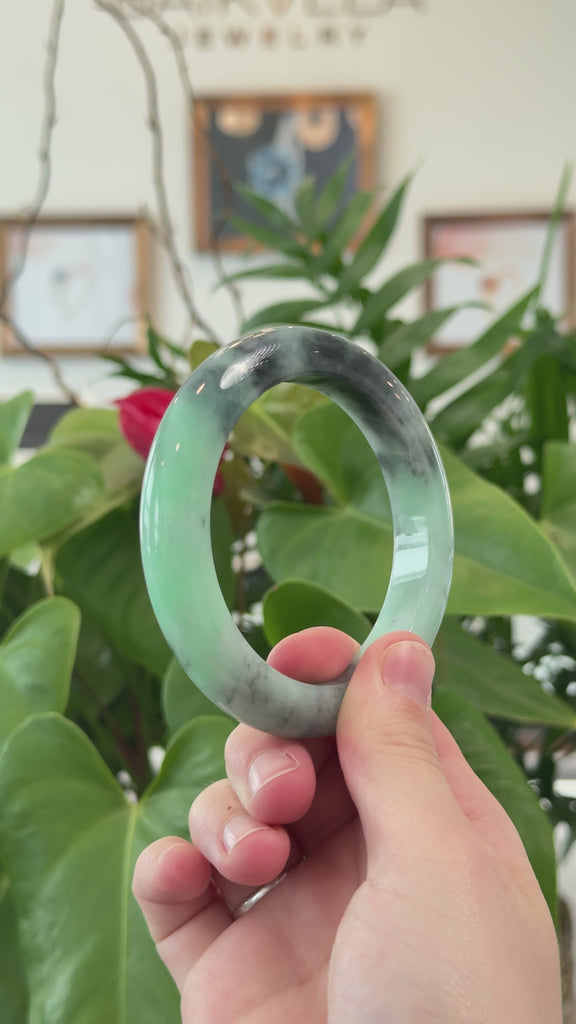 * DETAILS--This exquisite bangle is crafted from premium Burmese Jadeite in a apple green and wuji (black color) mixed hue. With its captivating color, it radiates a timeless elegance and cultural heritage. The classic half-round comfort design enhances the jade’s natural beauty with simplicity, making this bracelet a cherished addition to any jewelry collection. Just has a minimal natural cloudy spot with very minimal natural line. This bangle has such a unique color making this piece a thoughtful, one-of-a-kind gift for yourself or someone truly special.