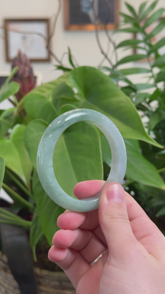 * DETAILS--- This beautiful bangle is made from premium Burmese Jadeite jade, featuring a smooth ice texture and a light oil-green color. Its classic half-round design highlights its natural beauty and ensures a comfortable fit, A timeless piece, perfect as a thoughtful gift for yourself or someone truly special.