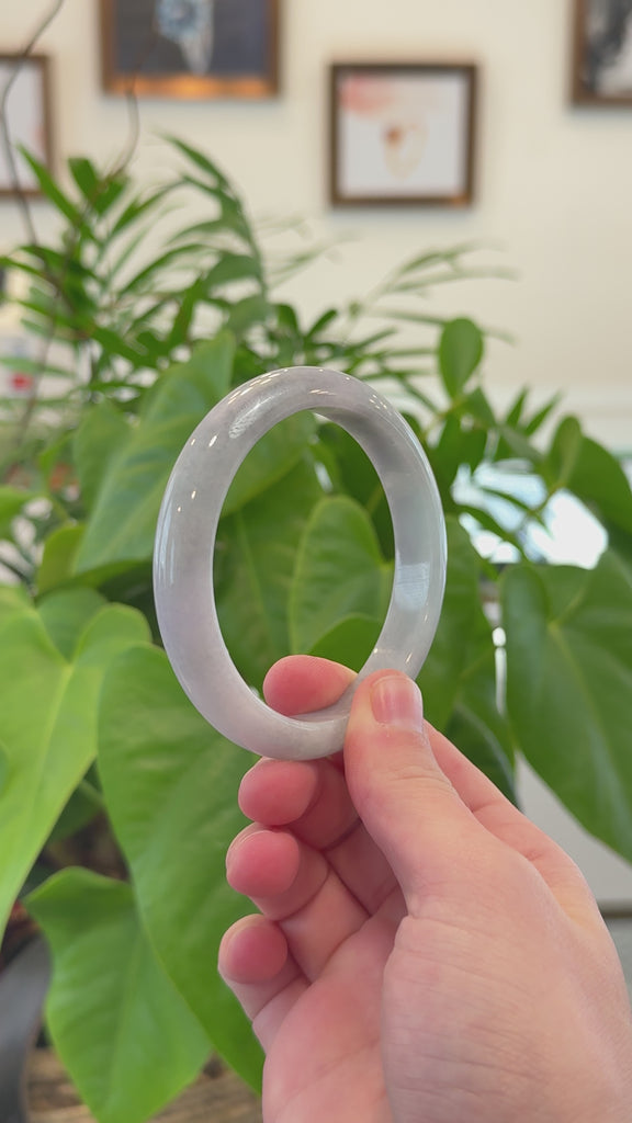 * DETAILS--- This beautiful bangle is made from premium Burmese Jadeite jade, featuring a smooth texture and a light purple lavender color. Its classic half-round design highlights its natural beauty and ensures a comfortable fit. Just has some natural clouds black points, and it's a bigger size, very affordable. A timeless piece, perfect as a thoughtful gift for yourself or someone truly special.