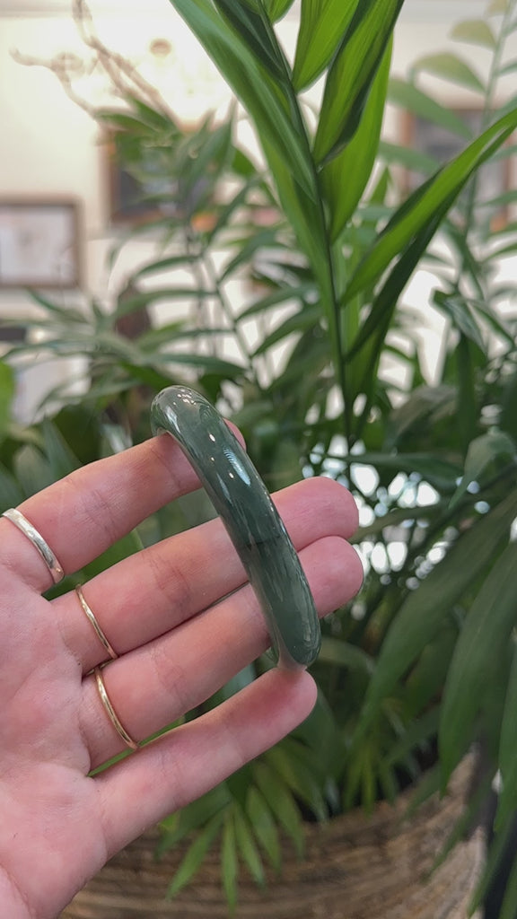 * DETAILS--- This beautiful jadeite bangle is made from natural Burmese Jadeite jade, featuring a semi texture and light icy. With a rich deeper green color through out. (Iron deposits) It's a half round, comfort-fit bangle, which is flat on the inside of the bangle and comfortable for everyday wear. Overall with just some cloudy spots and some natural lines. A timeless piece, perfect as a thoughtful gift for yourself or someone truly special.