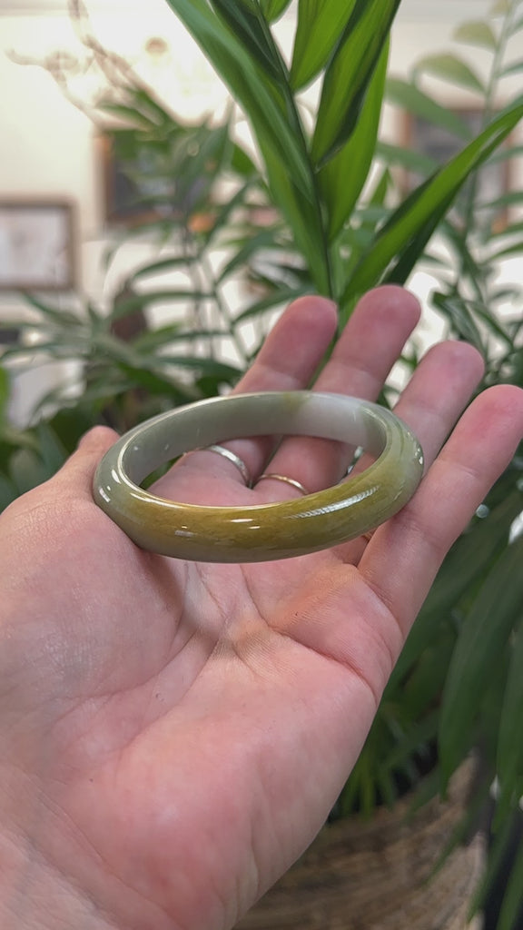 * DETAILS--- This beautiful bangle is made from natural Burmese Jadeite jade, featuring a smooth texture and lovely patches of brownish yellow color over a rich green base. Its classic half-round comfort fit design highlights its natural beauty and ensures a comfortable fit. This bangle has very minimal stone lines/ inclusions. Very few cloudy parts and a patch of light color. A timeless piece, perfect as a thoughtful gift for yourself or someone truly special.