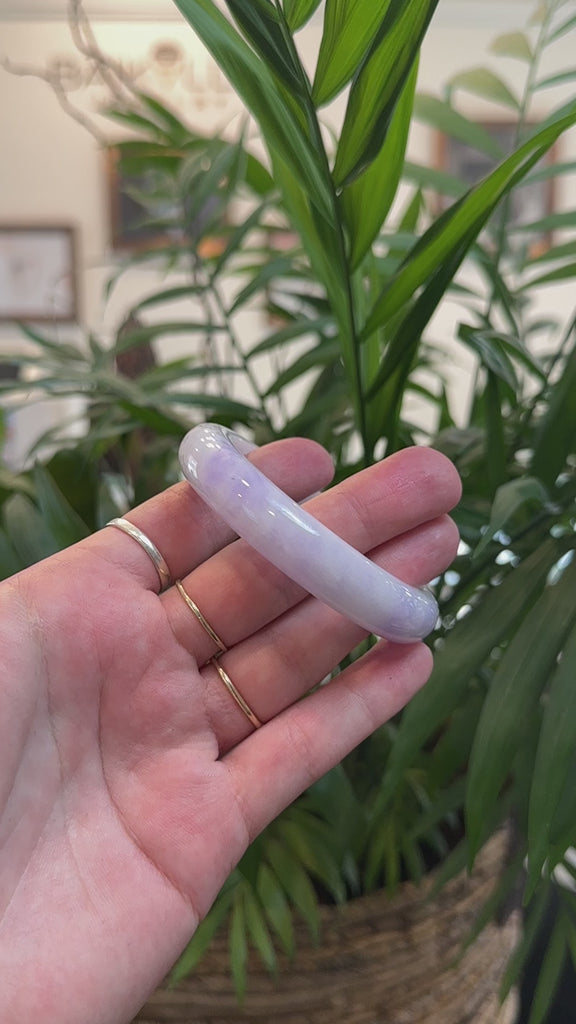 * DETAILS--- This beautiful bangle is made from natural Burmese Jadeite jade, featuring a smooth texture and lovely patches of purple lavender color. Its classic half-round comfort fit design highlights its natural beauty and ensures a comfortable fit. Just has some natural stone lines. With some patches of natural cloudy parts. A timeless piece, perfect as a thoughtful gift for yourself or someone truly special.