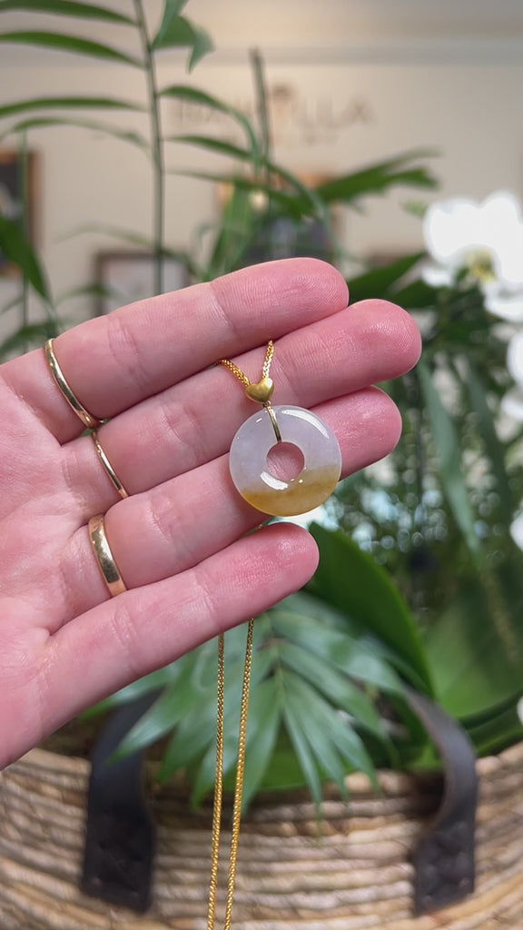 * Design Concept--- The Ping An Kou (Good Luck Button) is a Chinese symbol of peace, protection and well-being, believed to ward off negative energy and bring good fortune. This pendant is made with natural genuine Burmese jadeite jade featuring an icy white color on the top and a rich brown-ish yellow color on the bottom, creating a beautiful contrast. The pendant is finished with an elegant 18K yellow gold bail in a classic heart design. Gifting one of these is like wishing the best of luck to your family or loved ones.