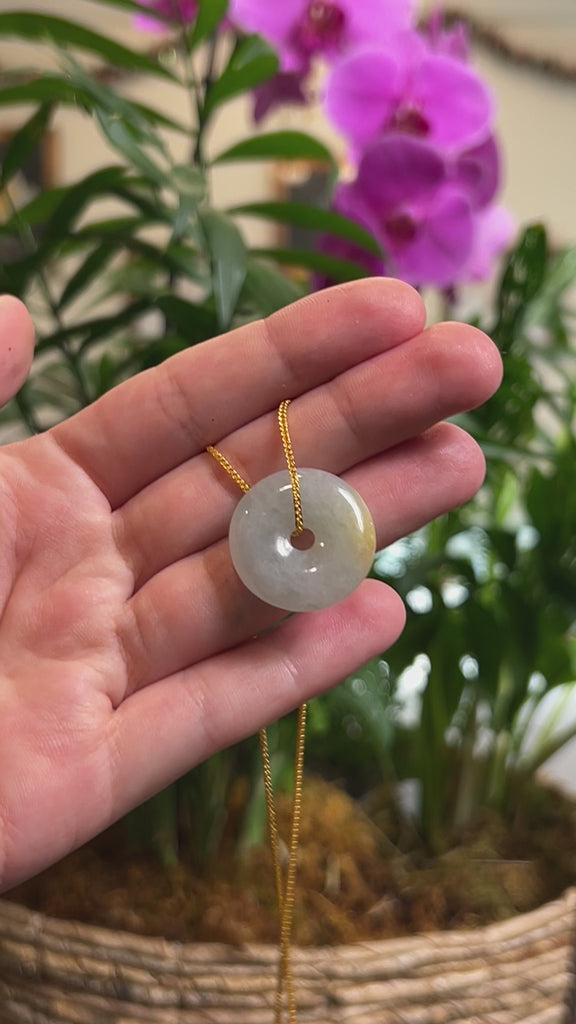 * Design Concept--- The Ping An Kou (Good Luck Button) is a Chinese symbol of peace, protection and well-being, believed to ward off negative energy and bring good fortune. This pendant is made with natural Burmese jadeite jade that features an icy light blue-green color throughout with a light yellow patch. Known for its durability, jadeite is also believed to bring good luck. Gifting one of these is like wishing the best of luck to your family or loved ones.