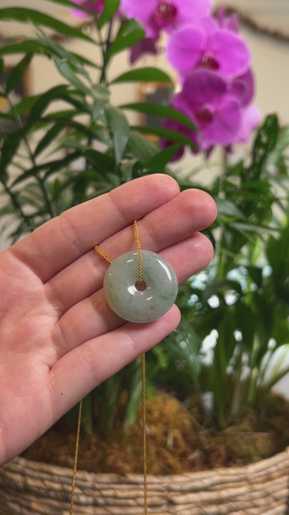 * Design Concept--- The Ping An Kou (Good Luck Button) is a Chinese symbol of peace, protection and well-being, believed to ward off negative energy and bring good fortune. This pendant is made with natural Burmese jadeite jade that features a light blue-green color throughout, with a yellow Sajin (Golden Dust) patch and deeper green flecks. Known for its durability, jadeite is also believed to bring good luck. Gifting one of these is like wishing the best of luck to your family or loved ones.