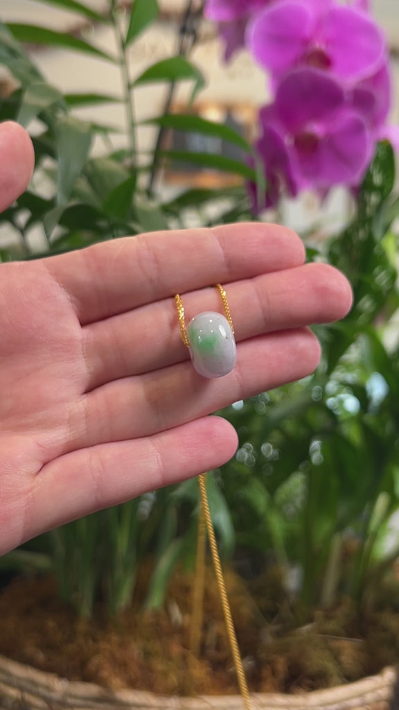 * Design Concept--- The Ping An Kou (Good Luck Button) is a Chinese symbol of peace, protection and well-being, believed to ward off negative energy and bring good fortune. This pendant is made with natural Burmese jadeite jade that features a light lavender & white color throughout with a vibrant green patch and small specks of Sajin (Golden Dust). Known for its durability, jadeite is also believed to bring good luck. Gifting one of these is like wishing the best of luck to your family or loved ones.