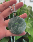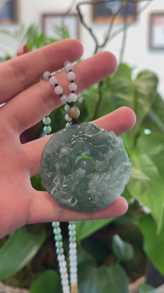 * Design concept: This exquisite dragon pendant is crafted from green and yellow jadeite jade, featuring a smooth, transparent finish. The intricate design showcases two majestic dragon in ice blue jade, surrounding a loose carved "golden ball" the dragons are playing with. It's so unique, a powerful symbol of good fortune and success, making this necklace a beautiful piece of collectible. This pendant is both a stunning accessory and a thoughtful gift for yourself or a cherished loved one.