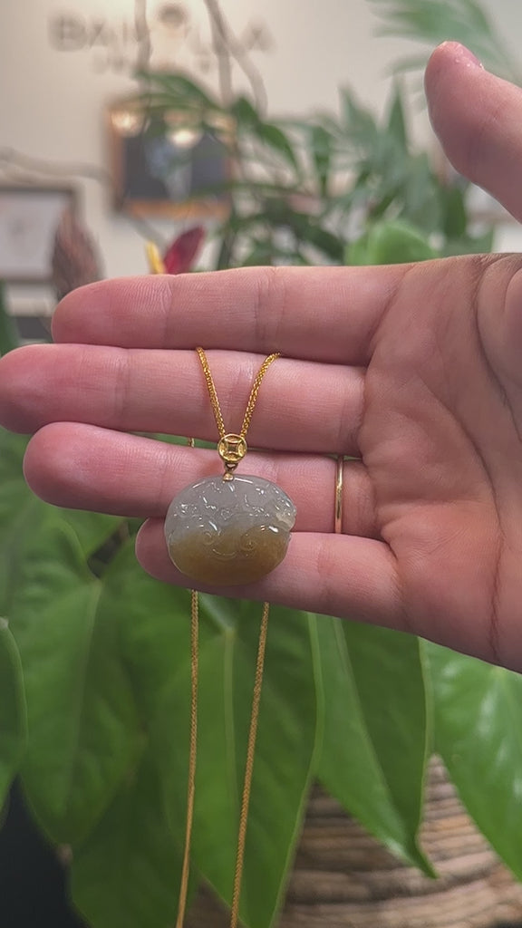*Design concept-- "Ruyi" in Chinese means "as you wish," symbolizing luck and prosperity. This elegant necklace features a timeless Ruyi design, that is carefully carved into the genuine Burmese jade that is icy green on the top half and a honey brown color on the bottom. The jade texture is smooth and semi-translucent. The bail is solid 18K yellow gold with a classic design. This pendant is the perfect gift for yourself or your loved ones, symbolizing luck and prosperity.