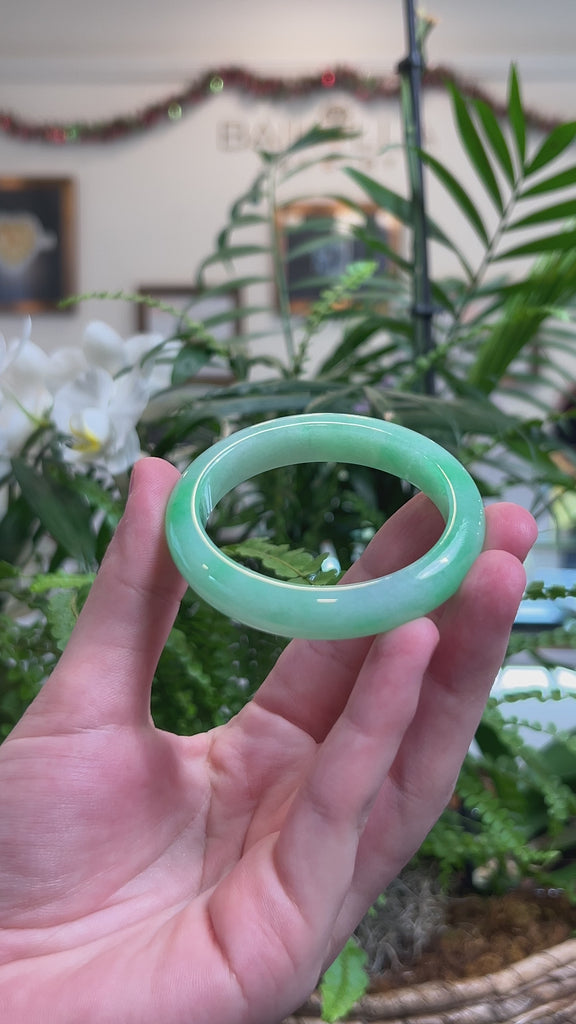 *DETAILS--- This oval bangle is crafted from fine-quality, natural Burmese Jadeite jade that features a vibrant apple-green color throughout. This lively green tone in jade is highly sought after and prized for its vibrancy. The jade texture is smooth and translucent with no natural lines and minimal cloudy spots. It's a half-round, comfort fit oval bangle that is flat on the inside, making it comfortable for everyday wear. Known for its durability, jadeite is also believed to bring good luck. Whether as a gift for yourself or a loved one, this jade bangle is a meaningful treasure that combines natural beauty, lasting craftsmanship, and exceptional value to cherish for years to come.