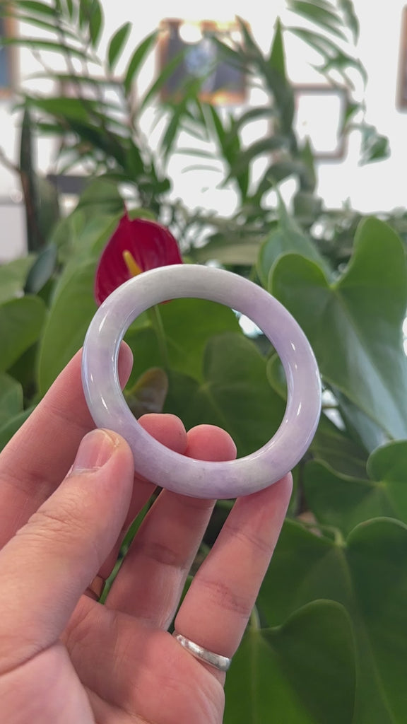 * DETAILS--- This bangle is crafted from quality, genuine Burmese light green & lavender Jadeite Jade. The jade’s texture is smooth and semi translucent, featuring a captivating lavender color mostly on one side and light green on the other, with no natural lines and very little small cloudy spots. It's a full round, traditional bangle, which is fully round throughout the bangle. Known for its durability, jadeite is also believed to bring good luck. This bangle makes a thoughtful and meaningful gift for yourself or someone special.