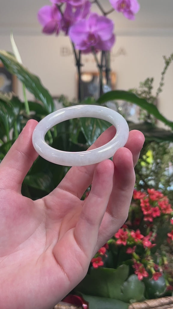 *DETAILS--- This bangle is crafted from natural Burmese Jadeite jade that features a light white color throughout with a faint green patch. The texture is semi-smooth and translucent with some natural lines and cloudy spots. It's a full round, traditional bangle, which is fully round throughout the bangle. Known for its durability, jadeite is also believed to bring good luck. Whether as a gift for yourself or a loved one, this jade bangle is a meaningful treasure that combines natural beauty, lasting craftsmanship, and exceptional value to cherish for years to come.