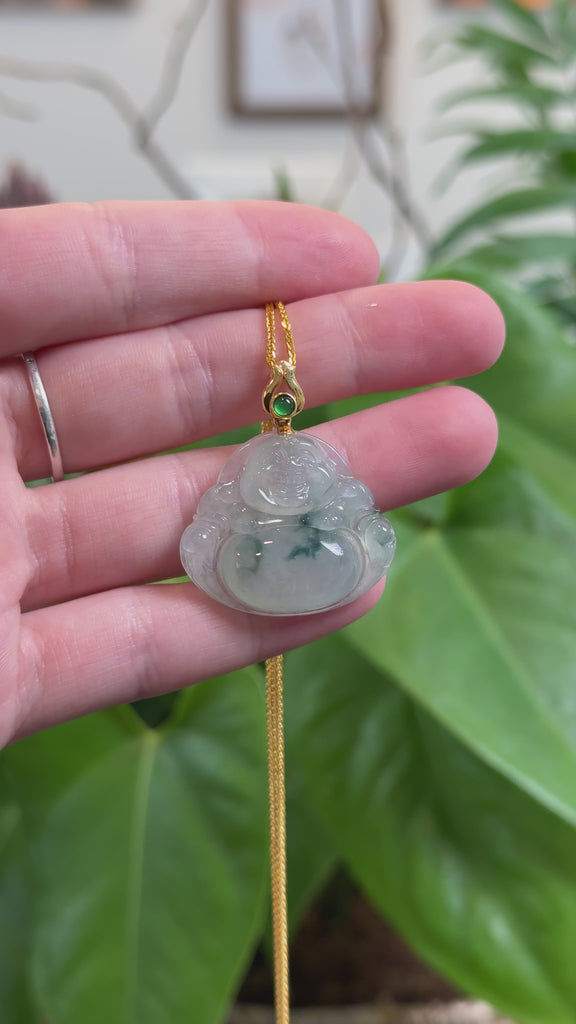 *Design concept--- This beautiful pendant is made from icy jadeite jade and features expert carving. Wearing a Happy Baby Buddha pendant is said to attract positive energy and uplift your surroundings. It symbolizes the release of negativity and encourages resilience. The term "Buddha" means "enlightened one," representing guidance and protection. This pendant embodies prosperity and good fortune, making it a perfect accessory for everyday wear.