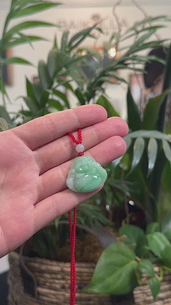 *Design concept--- This lovely pendant is made from green jadeite jade with expert carving that has a smooth, semi-translucent. The color is a vibrant apple green with a light green base color throughout. Finished with a lavender jade bead and classic red adjustable nylon string. Wearing a Happy Buddha pendant is believed to bring positive energy and joy. It symbolizes letting go of negativity and staying strong. "Buddha" means "enlightened one," offering guidance and protection. For those who follow Buddhism, this pendant represents good fortune and prosperity, making it a meaningful choice for daily wear.