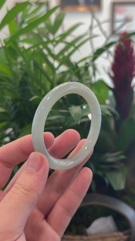 * DETAILS---This exquisite bangle is crafted from premium Burmese jadeite in a ice hue. With its smooth, translucent texture and captivating color, it radiates a timeless elegance and cultural heritage. The round comfort design enhances the jade’s natural beauty with clarity and simplicity, making this bracelet a cherished addition to any jewelry collection. Known to symbolize protection and strength, jade bangles hold deep meaning, making this piece a thoughtful, one-of-a-kind gift for yourself or someone truly special.