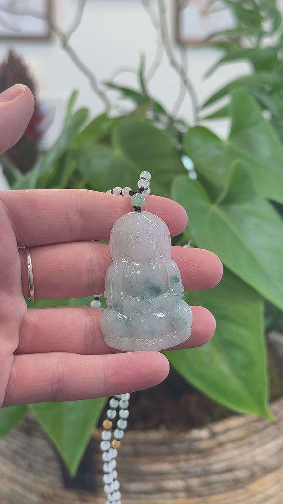 *Design concept--- Made with genuine Burmese jadeite jade. The excellent craftsmanship portrays the "goddess of compassion", the Guan Yin. The handcraft is stunning. This particular necklace has amazing translucency, with a very special ice lavender color. Great size for both men and women.